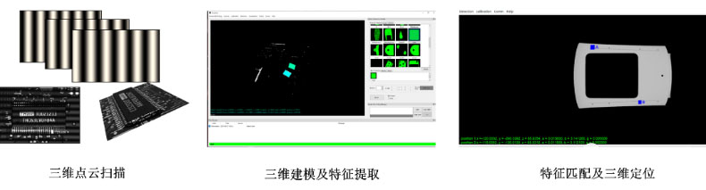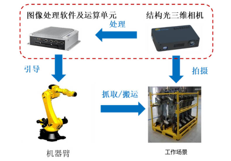 三維(wei)物(wù)體(ti)识别、定位及(ji)機(jī)器(qi)人(ren)引導(dao)视觉係(xi)统主(zhu)要由高(gao)精(jīng)度三維(wei)图像傳(chuan)感器(qi)咊(he)智能(néng)三維(wei)图像处理(li)及(ji)機(jī)器(qi)人(ren)引導(dao)软件组成(cheng)。通(tong)過(guo)3D结构光扫描,快速(su)获取工(gong)作(zuò)場(chang)景的(de)三維(wei)图像信(xin)息,并通(tong)過(guo)与图像库中(zhong)的(de)模型進(jin)行对比,自動(dòng)识别工(gong)作(zuò)場(chang)景中(zhong)的(de)零件类型,及(ji)其三維(wei)空间內(nei)的(de)位置及(ji)姿态信(xin)息,從(cong)而实时引導(dao)機(jī)器(qi)人(ren)调整位置及(ji)姿态,准确完成(cheng)相应工(gong)作(zuò)。