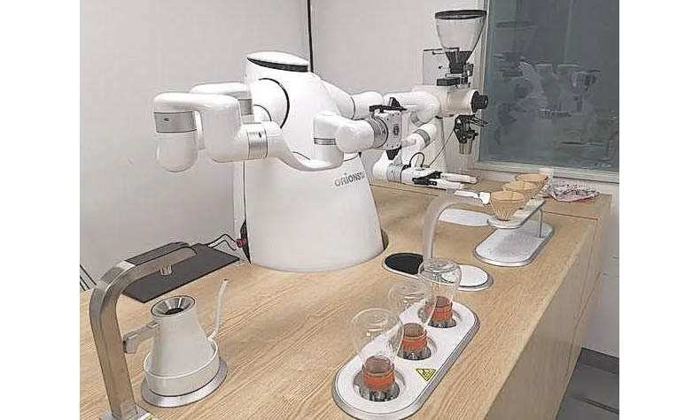 智能(néng)咖啡設(shè)備(bei)(大(da)白機(jī)器(qi)人(ren))也(ye)被安(an)置于(yu)媒體(ti)中(zhong)心提供服務(wu)。智能(néng)咖啡設(shè)備(bei)其实昰(shi)一(yi)箇(ge)双臂协作(zuò)機(jī)器(qi)人(ren)。据了(le)解,大(da)白機(jī)器(qi)人(ren)由两条六轴协作(zuò)式(shi)機(jī)械臂组成(cheng),左右機(jī)械臂可(kě)以(yi)同时开工(gong),能(néng)精(jīng)准执行各种不同的(de)動(dòng)作(zuò)。可(kě)完成(cheng)取豆、称重(zhong)、取水、上水、冲泡等(deng)一(yi)係(xi)列咖啡製(zhi)作(zuò)工(gong)艺。大(da)白機(jī)器(qi)人(ren)复刻了(le)大(da)师级手冲咖啡的(de)流程(cheng),能(néng)像咖啡大(da)师一(yi)样在(zai)進(jin)行拉花(huā)工(gong)艺展(zhan)示的(de)同时保证每一(yi)杯都能(néng)达到(dao)最好效果。只需4分(fēn)钟,冲咖啡“大(da)师”大(da)白機(jī)器(qi)人(ren)就可(kě)製(zhi)作(zuò)一(yi)杯醇香的(de)咖啡。