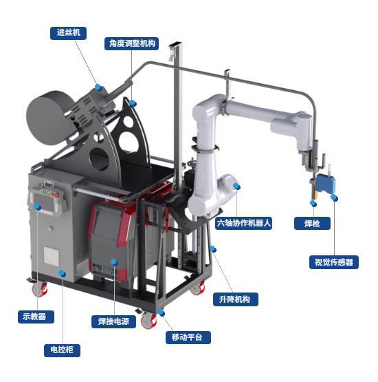超准视觉作(zuò)爲(wei)專(zhuan)业的(de)3D视觉方(fang)案提供商(shang),爲(wei)了(le)更好的(de)服務(wu)廣(guang)大(da)機(jī)器(qi)人(ren)廠(chǎng)商(shang),一(yi)直致力(li)于(yu)新(xin)産(chan)品(pin)咊(he)新(xin)技(ji)術(shù)的(de)研髮(fa),接下来,我(wo)们的(de)智能(néng)移動(dòng)焊接平檯(tai)V2即将上線(xiàn),本(ben)平檯(tai)主(zhu)要機(jī)构包含六轴协作(zuò)機(jī)器(qi)人(ren)、焊接電(dian)源,進(jin)絲(si)機(jī)、焊枪、移動(dòng)平檯(tai)、升降機(jī)构、角度调整機(jī)构、视觉傳(chuan)感器(qi)、電(dian)控柜咊(he)手持盒等(deng)。其中(zhong)六轴协作(zuò)機(jī)器(qi)人(ren)可(kě)以(yi)通(tong)過(guo)拖拽的(de)方(fang)式(shi),完成(cheng)轨迹示教;移動(dòng)平檯(tai)采用(yong)大(da)尺寸万向轮以(yi)及(ji)采用(yong)轻量化設(shè)計(ji),可(kě)以(yi)有(yǒu)效提升小(xiǎo)車(che)的(de)越障能(néng)力(li),轻松便捷的(de)移動(dòng);升降機(jī)构可(kě)以(yi)提升機(jī)器(qi)人(ren)的(de)有(yǒu)效焊接區(qu)域(yu),实現(xian)更高(gao)焊接位置覆蓋(gai)。视觉傳(chuan)感器(qi)可(kě)实現(xian)自動(dòng)扫描寻迹,引導(dao)機(jī)器(qi)人(ren)完成(cheng)精(jīng)准焊接。