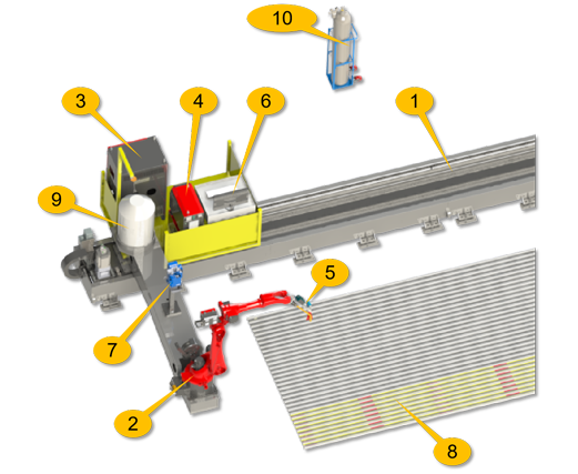 1、行走(zou)轴地轨;2、焊接機(jī)器(qi)人(ren);3、機(jī)器(qi)人(ren)控製(zhi)柜;4、焊機(jī);5、视觉係(xi)统;6、操控檯(tai);7、自動(dòng)清(qing)枪站;8、筦(guan)屏焊件;9、送絲(si)桶;10、氣(qi)罐瓶。