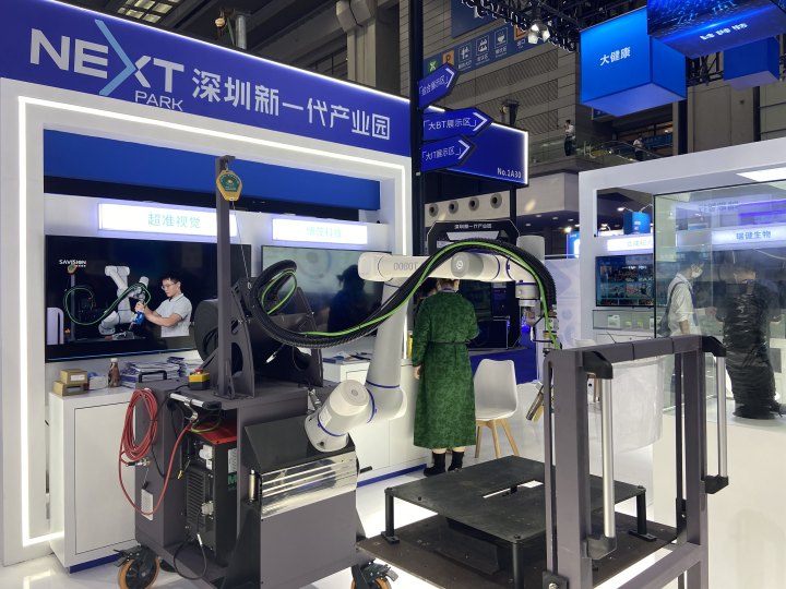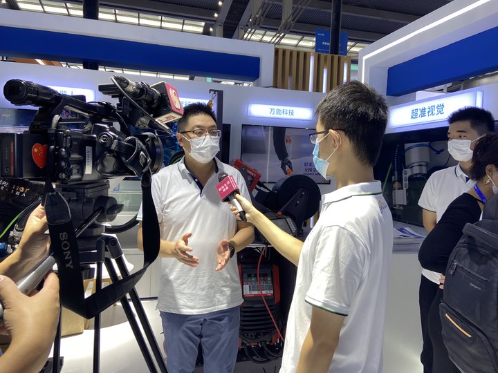 工(gong)作(zuò)人(ren)員(yuan)爲(wei)观众介绍智能(néng)移動(dòng)焊接平檯(tai)的(de)操作(zuò)